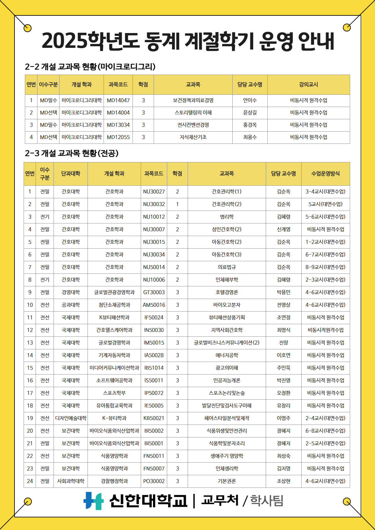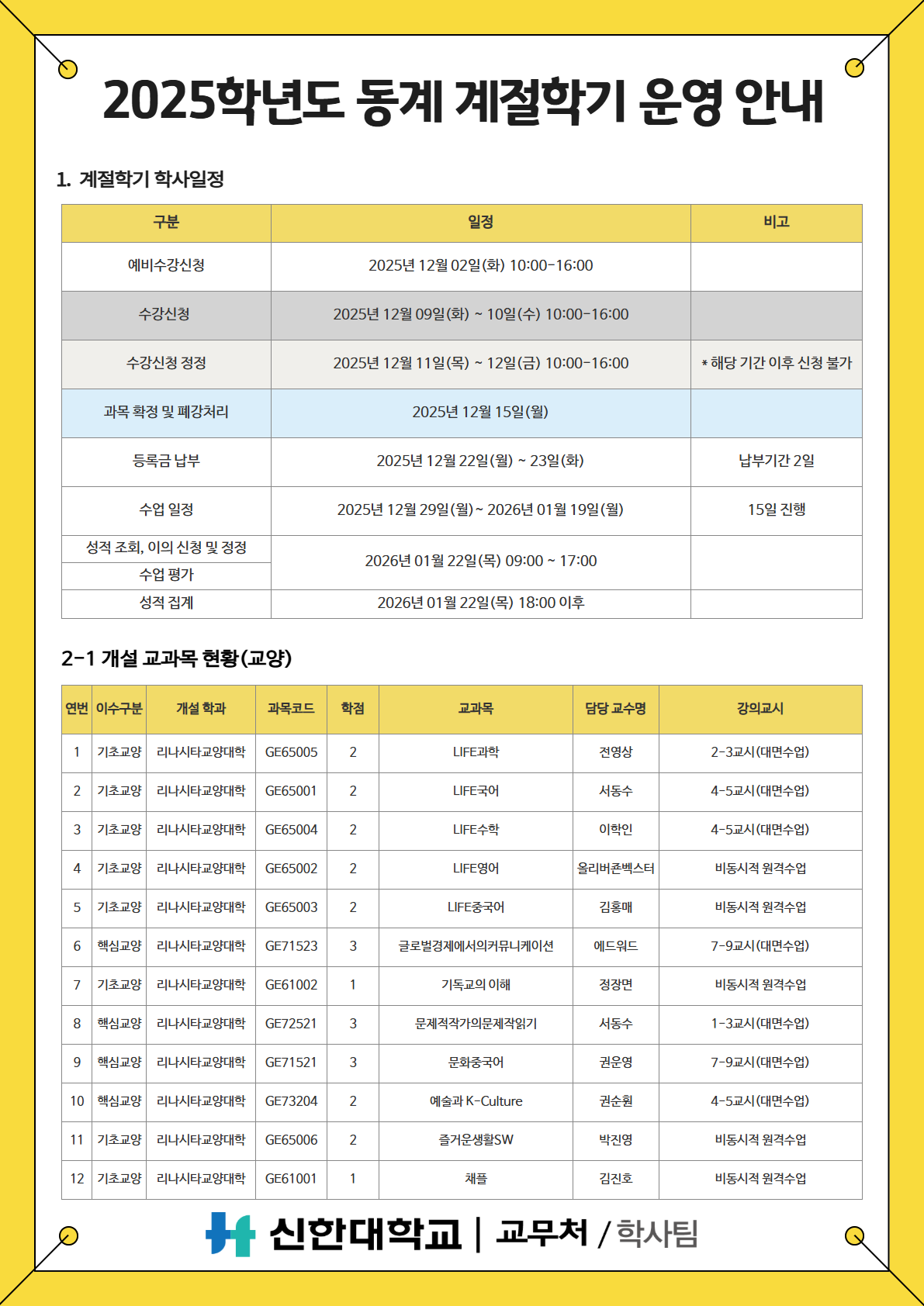 [학사팀/수업] 2025학년도 동계 계절학기 운영 안내