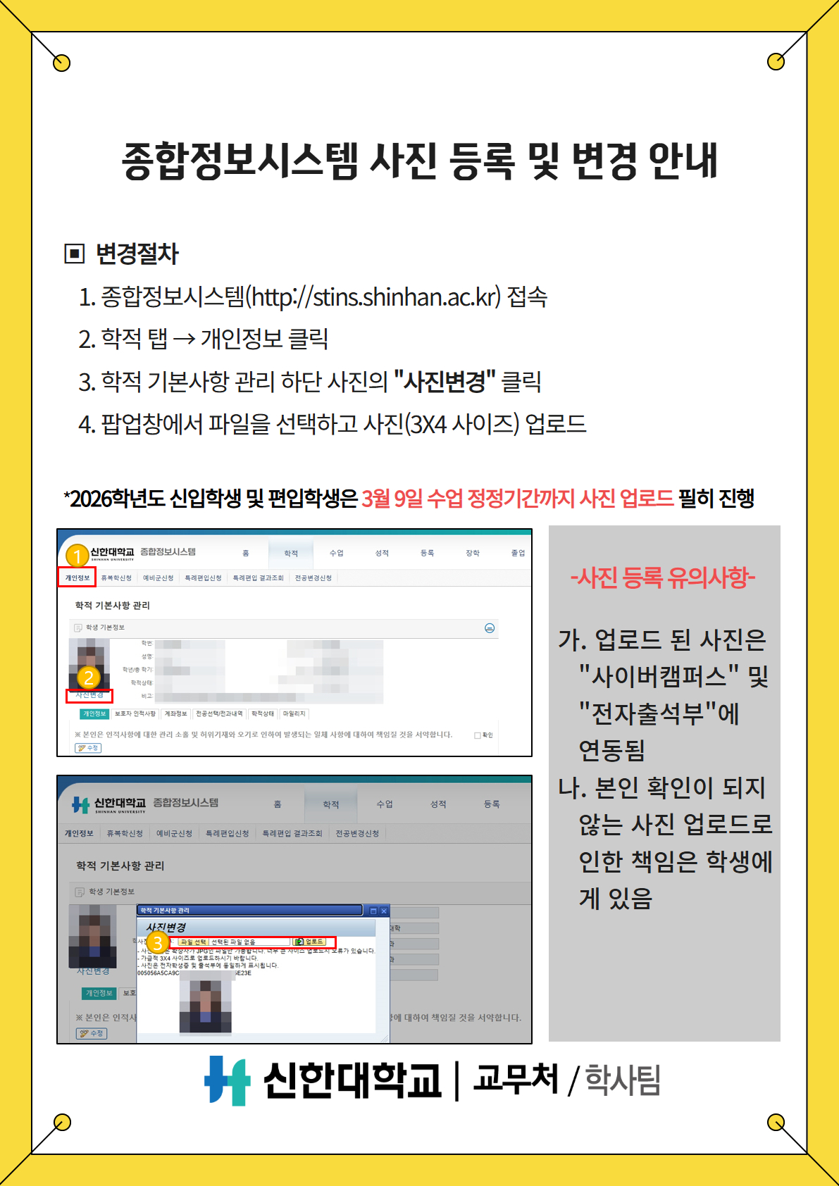 [학사] 종합정보시스템 사진 등록 및 변경 안내(*2026학년도 신입생 및 편입생 필독)