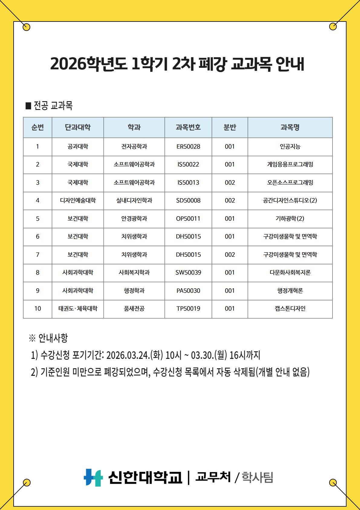 [학사팀/수업] 2026학년도 1학기 2차 폐강 교과목 안내