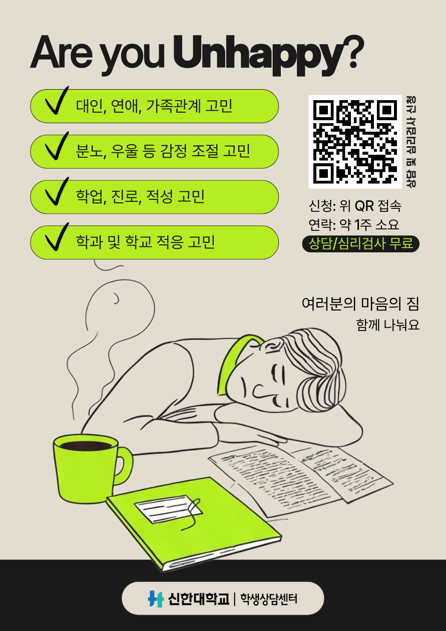 혼자 끙끙 앓고 있는 고민이 있다면 학생상담센터의 문을 두드려보세요.