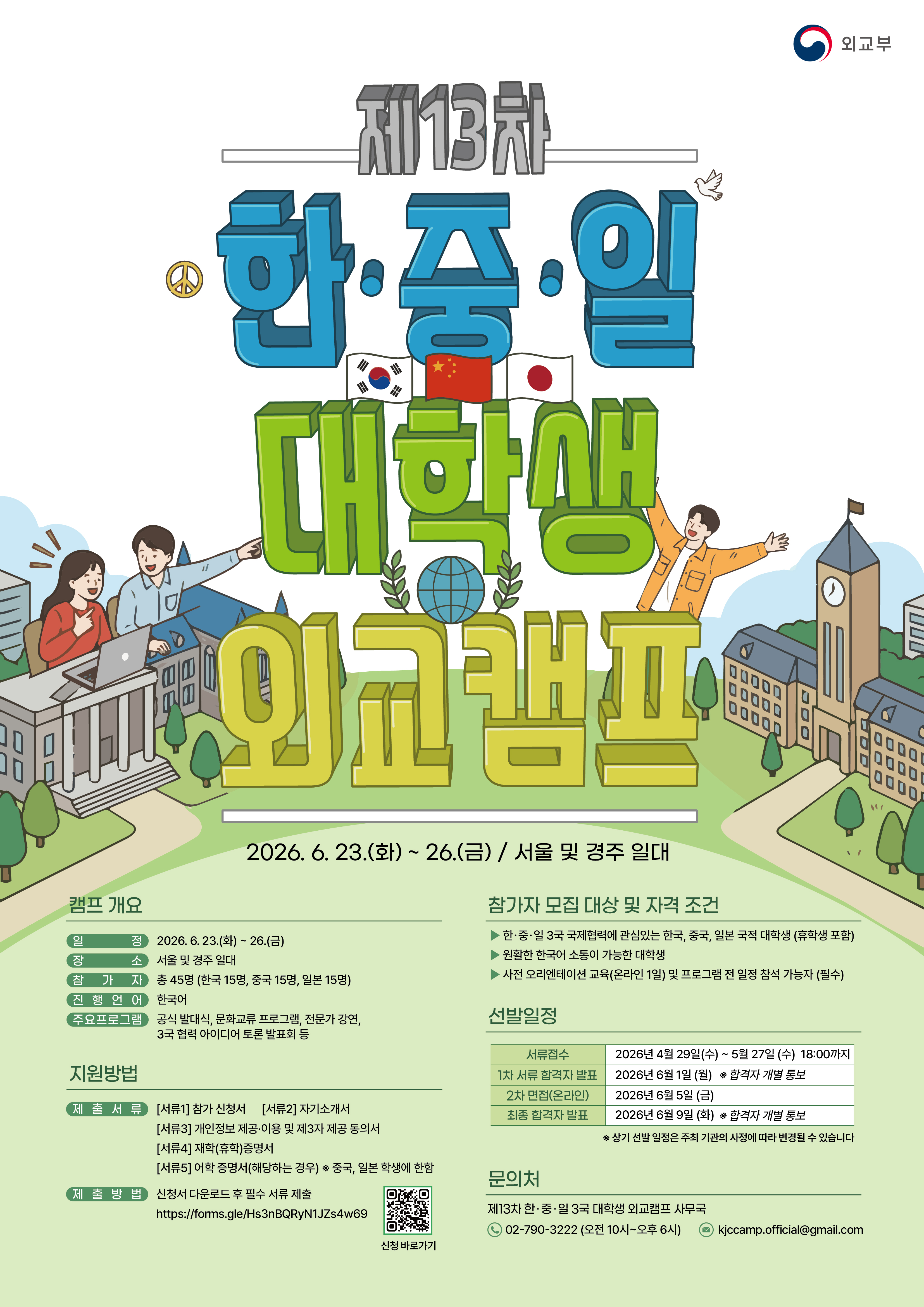 외교부는 한국, 중국, 일본 3국 대학생 간 교류를 위해 3국 미래세대 신뢰 구축 및 3국 협력의 저변을 확대 및 강화하고자 아래와 같이 제13차 한중일 3국 대학생 외교캠프를 개최할 예정입니다.